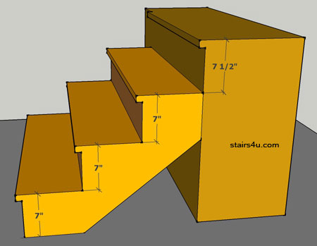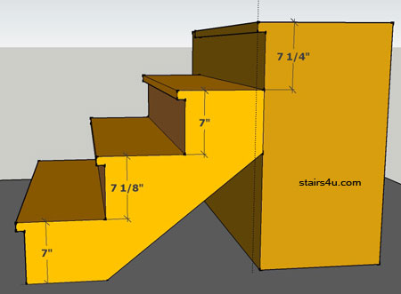 Three Step Stairway Example 1: The bottom riser is 7 inches, the second riser is 7 inches, the third riser is 7 inches but the fourth riser is 7 1/2 inches. There is more than 3/8 of an inch variation between the smallest and tallest riser and this particular stairway wouldn't pass most building inspections.